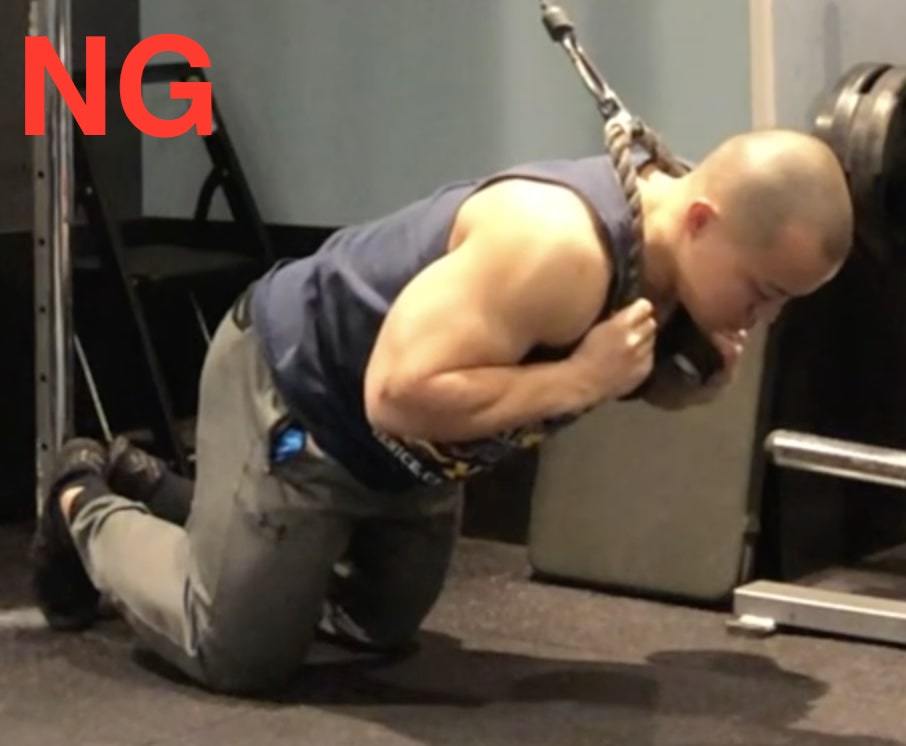よくある問題として挙げられるのは、腹筋が収縮する感じがしないことです。背筋が曲がらず、脊柱をみぞおちから丸められていないために起こります。ケーブルの負荷を、体重を利用して前に引っ張っているだけになってしまっているのです。この場合、腹直筋から腸腰筋に負荷が逃げるだけでなく、筋肉へ与える負荷も落ちてしまいます。