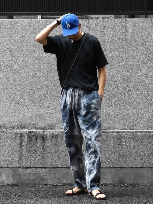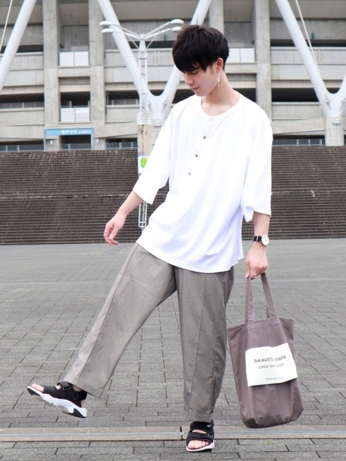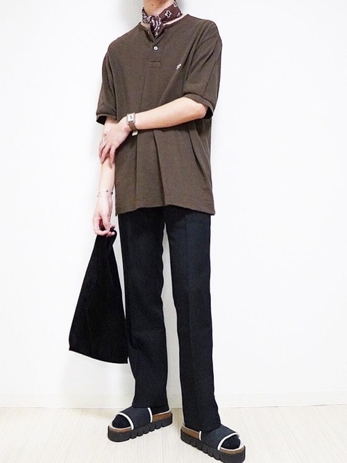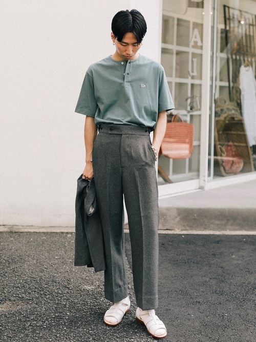 ワイドスラックスと合わせたシンプルラフな同色系の半袖コーデです。グレーやブラック等の同色系にすることで統一感のある着こなしになっています。全体的にワイドなシルエットですが、足元をサンダルにすることで抜け感が出ています。