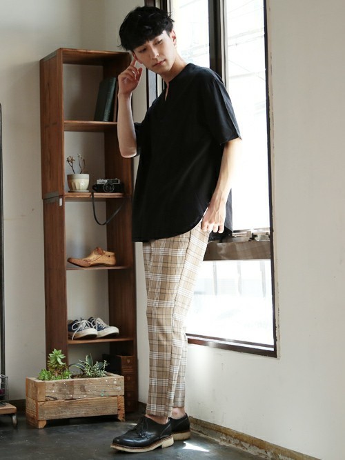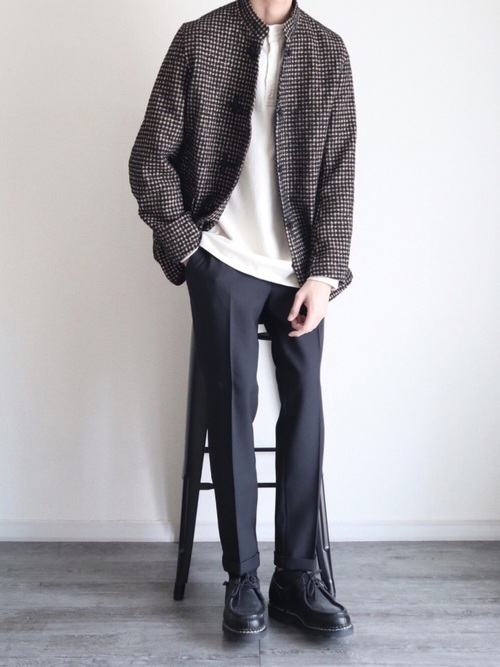 大柄チェックパンツと合わせたシックなコーデです。ラフなシルエットのトップスに革靴を合わせることで、程よいきちっと感が出てスタイリッシュな着こなしとなっています。