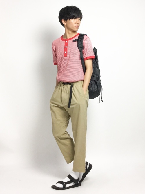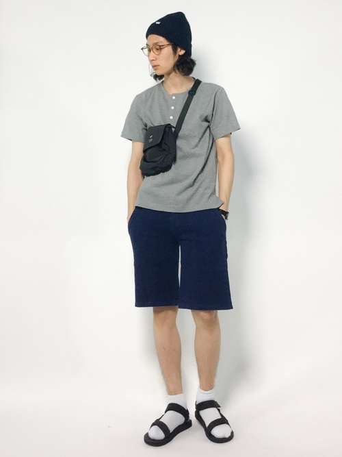 ハーフパンツは非常にラフなアイテムですが、カットソーのボタンをきっちり上まで閉じることでラフすぎないスタイリッシュなコーデとなっています。そこにサンダルやボディバッグを合わせることで、コーデにメリハリがついています。