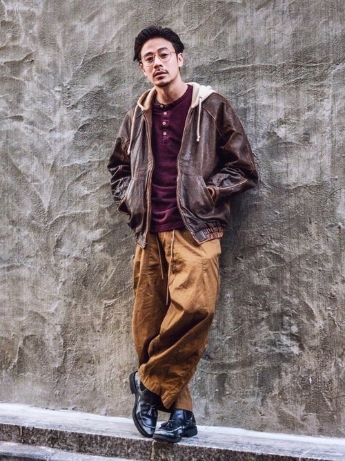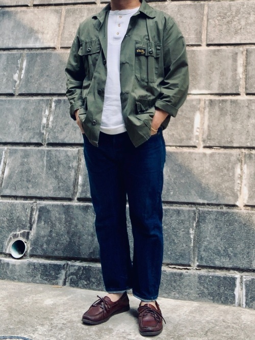 ミリタリージャケットと合わせたアメカジコーデです。足元をきれいめの靴にすることで品がプラスされ、カットソーのラフさを上手く活かした着こなしです。