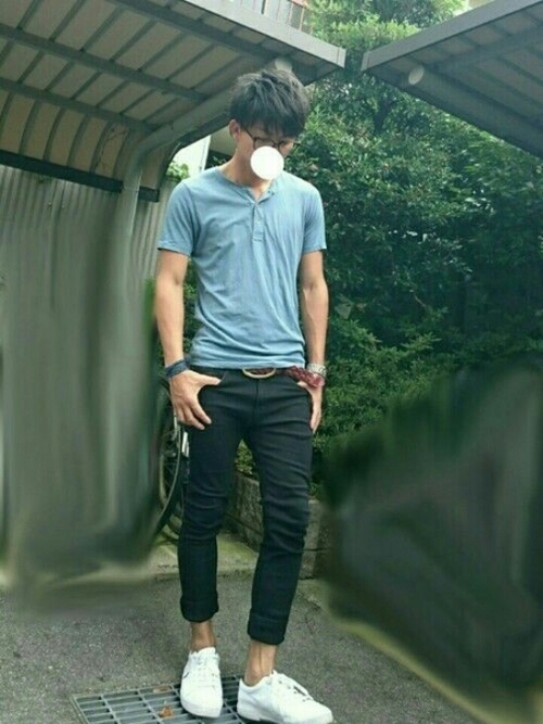 クロップドパンツと合わせたメンズらしい、シンプルかっこいいコーデです。ブラックのパンツとグレーのトップスを合わせるとワイルドな雰囲気が強くなりますが、足元の白のスニーカーでラフさを加えワイルドさを少し抑えています。