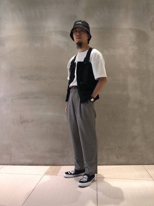 カットソーとベストのレイヤードコーデです。ミリタリー感のある装いに、タックパンツの上品さがプラスされています。足元をスニーカーにすることでかたすぎない着こなしとなっています。