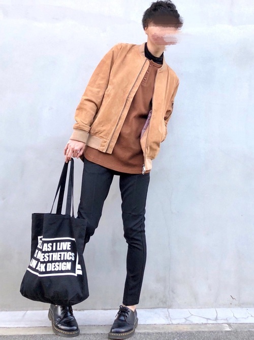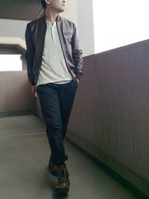 ライダースと合わせた、キレカジでクールなメンズコーデです。ライダースとブーツをブラウンで統一することで、まとまりがあり程よくワイルドさが加わった着こなしです。