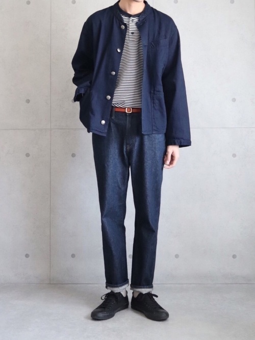 ボーダーカットソーとジャケットを合わせたスタイリッシュで品のあるコーデです。ボーダーのカットソーはラフな印象ですが、ユニクロのテーパードジーンズとその他アイテムを同色系にすることでまとまりすっきりとした着こなしになっています。