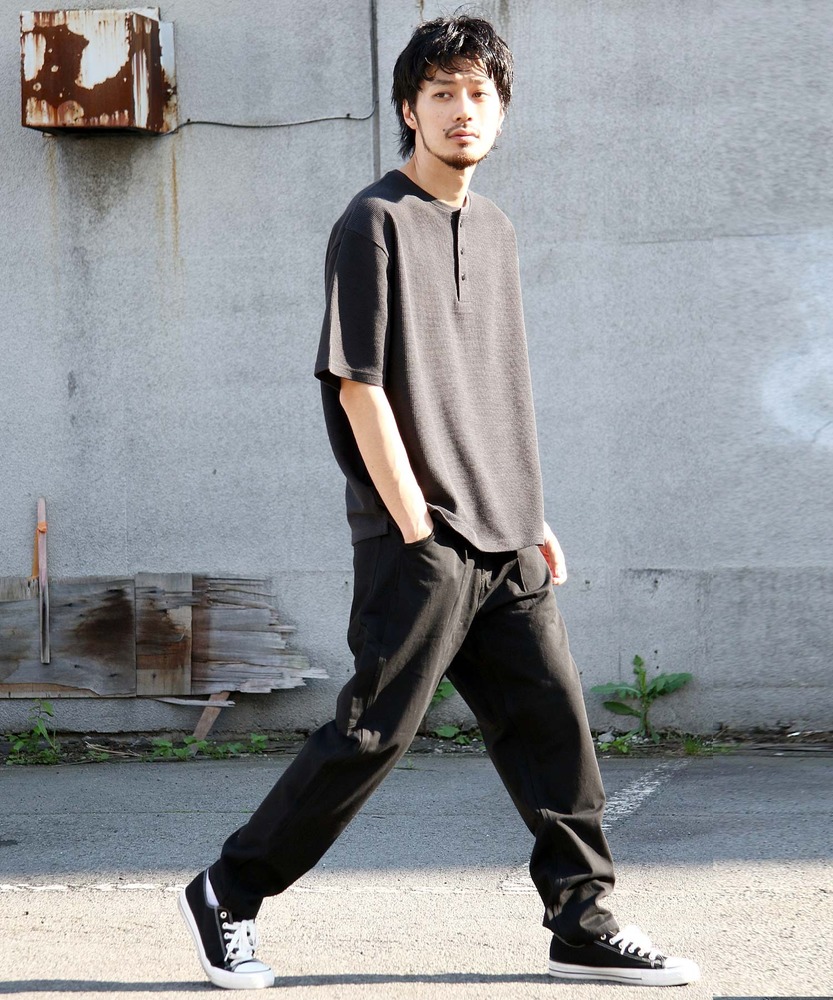 ヘンリーネックTシャツを選ぶときはサイズ感がとても大切です。このカットソーはワイルドやラフな印象を与えます。しかしサイズを間違えるとだらしなく見えたり頼りない印象に見えてしまうので、自分のサイズに合ったものを選ぶことが重要です。