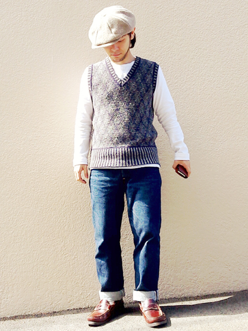 ニットベストとヘンリーネックTシャツのラフながらも品のあるコーデです。ベストのきちっと感と、ヘンリーネックのラフさが絶妙で、革靴が良いアクセントとなっています。ベストと帽子が個性的に見えますが、ヘンリーネックを合わせることでコーデに馴染み統一感が出ています。