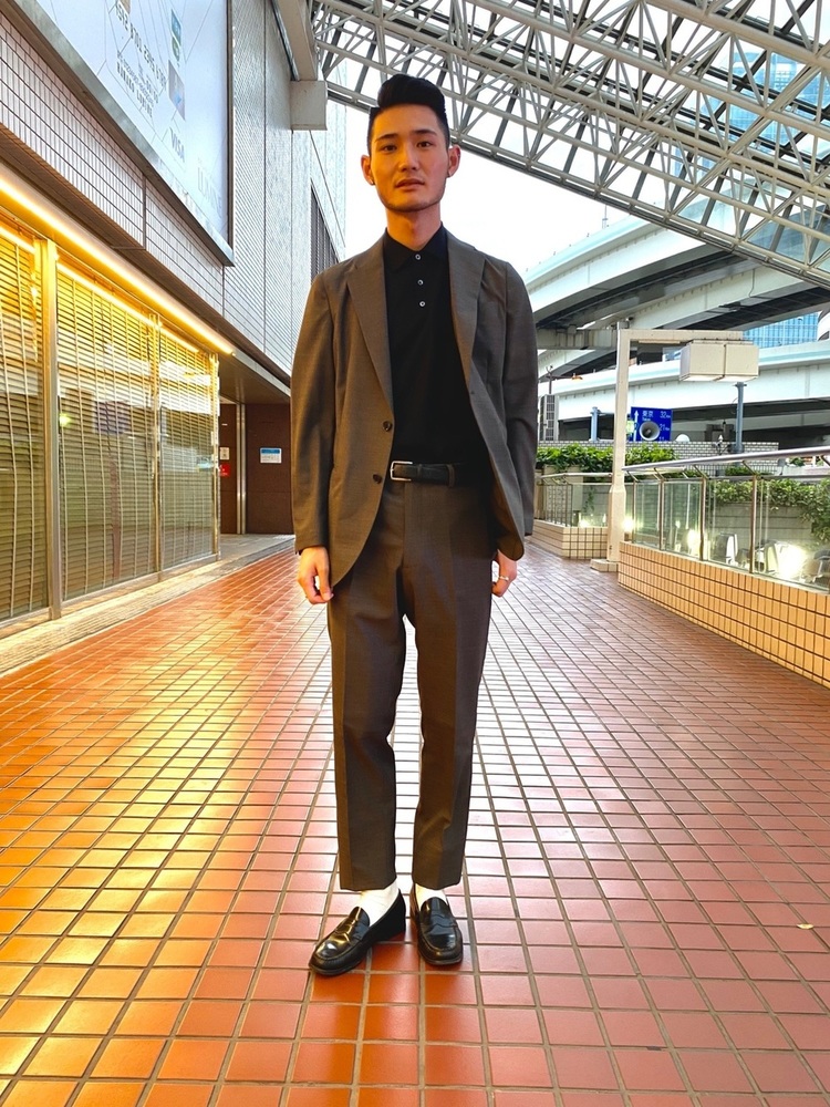 インナーにポロシャツを合わせたクールビズスーツスタイルです。スポーティーなイメージのあるポロシャツも、ジャケットを羽織れば上品な印象に早変わり。ボタンをすべて留めると誠実さもプラスされ、黒革のローファーの似合う大人コーデが完成します。ホワイトソックスのチラ見せで、コーデ全体をグッと引き締めているのも良いですね。