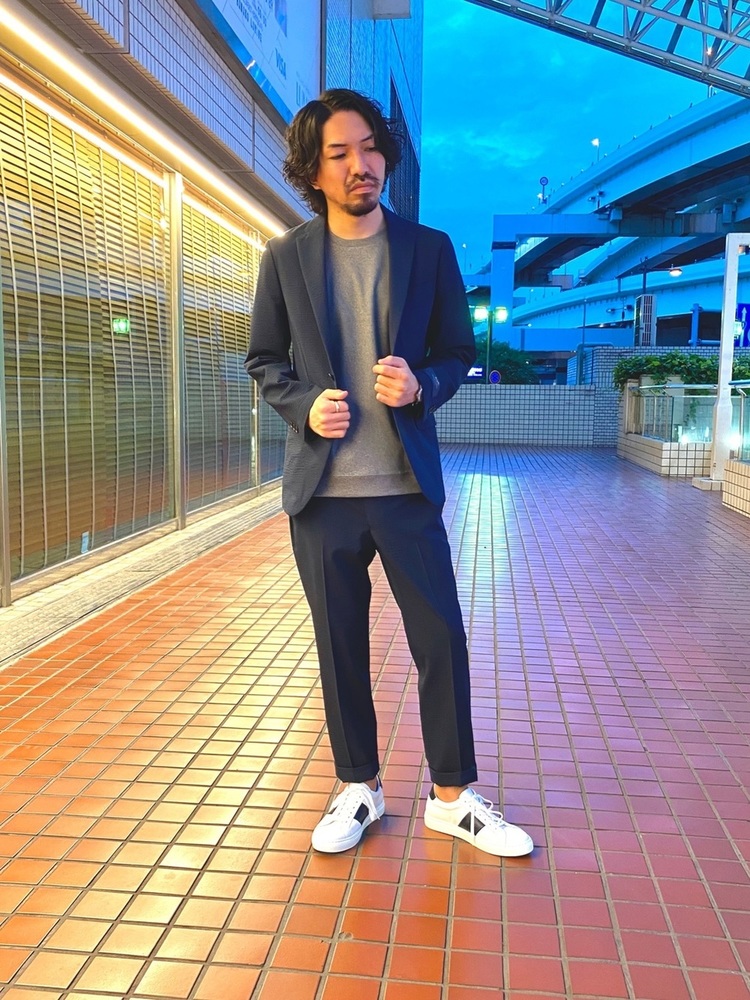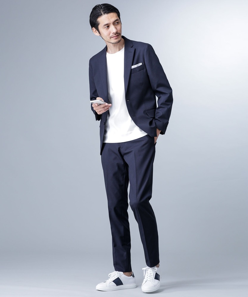 シアサッカー素材のやわらかなスーツを、Tシャツとスニーカーでカジュアルダウンしたコーデです。落ち着いた色味でまとめたミニマルな着こなしは、スーツ×スニーカーの王道スタイルといったところ。スーツをデイリーユースとして取り入れる際に、ぜひお手本にしたいコーデです。