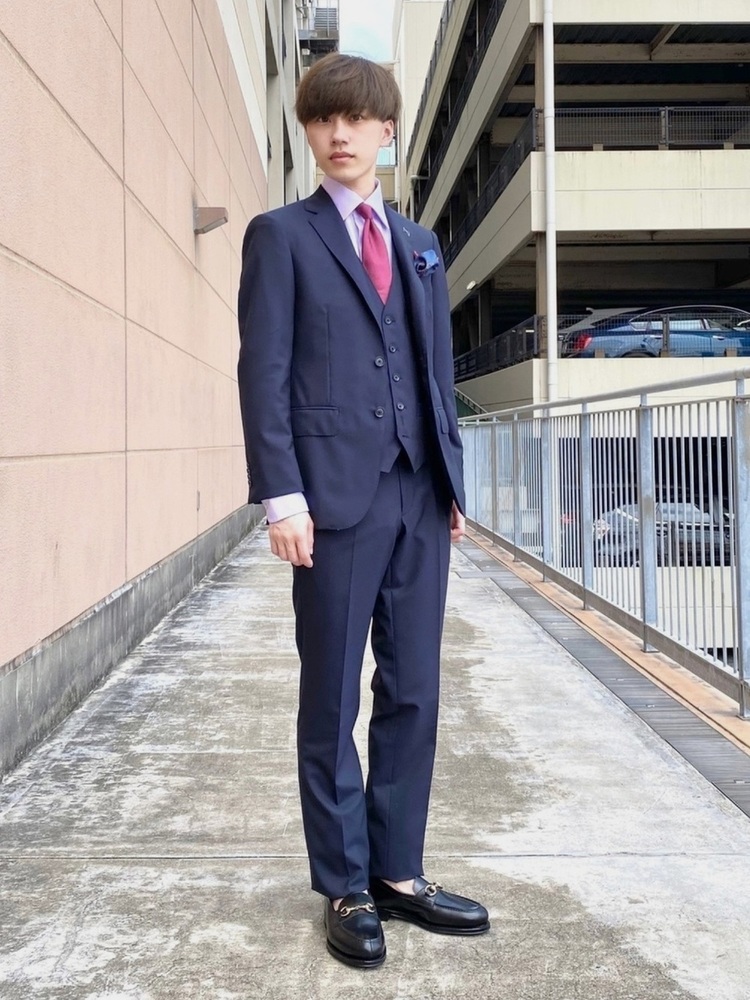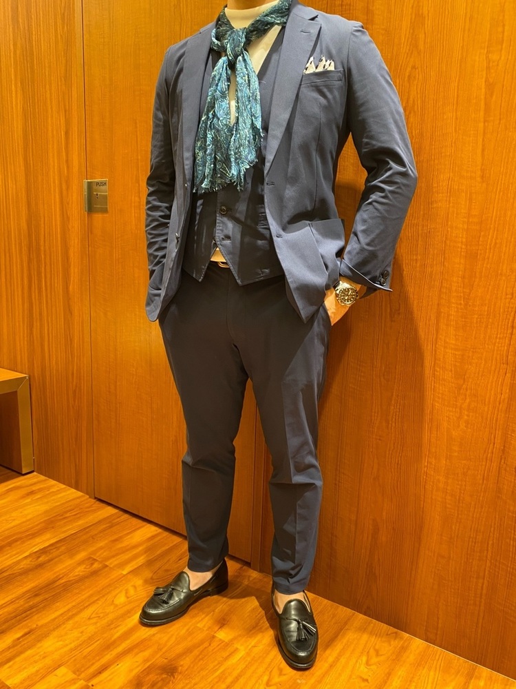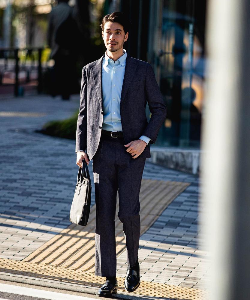 知的で清潔感のある青系の色は、ビジネスシーンにおいて最適な色味です。濃い色であればあるほど落ち着いた雰囲気になるので濃紺の青を選びたいところですが、それだと夏場は重苦しい印象を与えてしまうことも。同じ青でもグッと明るいライトネイビーをチョイスすれば、爽やかで清涼感のある夏の着こなしが完成します。