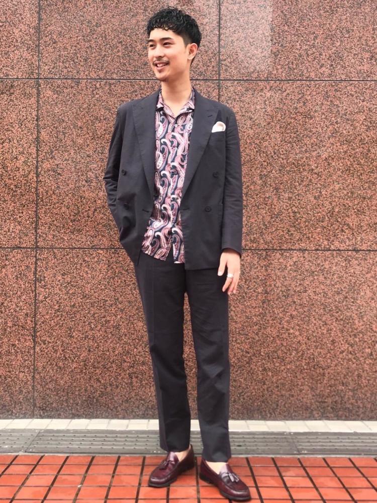 インナーにオープンカラーシャツを合わせた、こなれ感溢れる夏のスーツコーデです。1枚でも目を惹く色柄のシャツが柔らかいリネンのスーツと合わさり、男性のもつ色気を引き立てます。カジュアルでラフな装いなので、オフの日におすすめです。オープンカラーシャツは、敢えてボタンを留めて裾をインすると、上品さがでて一味違う着こなしが楽しめます。