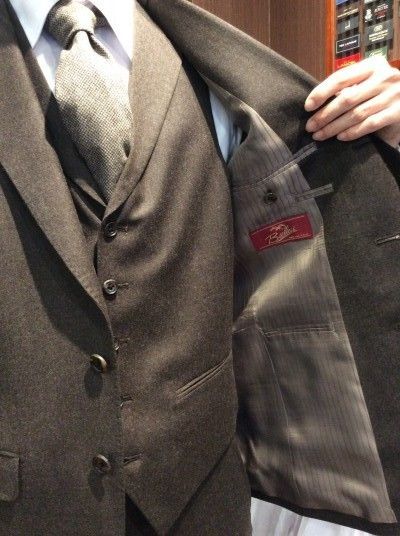 スーツの裏地の基本である総裏はジャケットの裏面全体に裏地があるのに対し、背抜きは背部分1/3とサイドの前身に裏地がついています。背中の大部分の裏地がカットされるので、軽さと通気性が格段にアップします。オールシーズン使えるスーツでもよく採用されますが、冬場は保温性が低いためベストで寒暖を調整し、ベスト付きの3ピースでの着用が主流です。