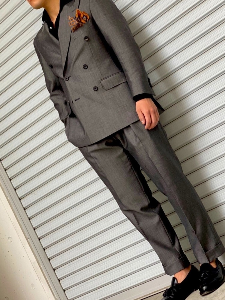 夏らしい見た目のこちらのスーツは、イタリアREDA社のREDA ACTIVE生地を使用した逸品。ウール100%なので通気性が良く、サラッとした着心地を保てます。自然なストレッチ感もあり軽量で、防シワ効果があるのも夏には嬉しいポイント。ウエストラインを強調しつつも胸に適度なゆとりをもたせたデザインは、ブランドの象徴的なシルエットと言われています。