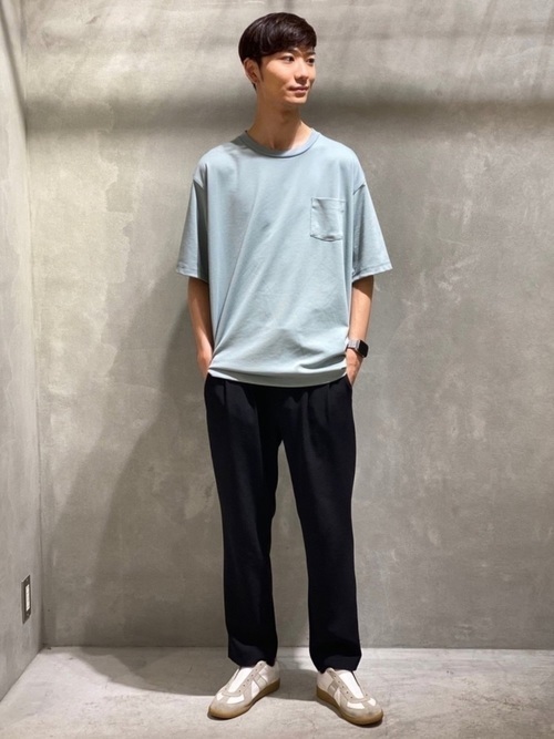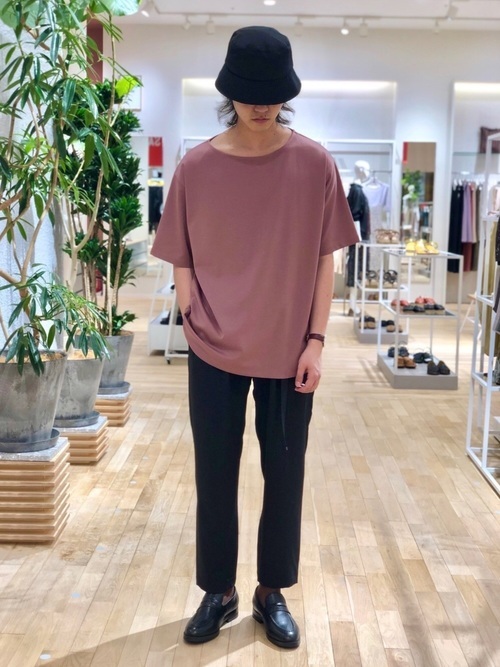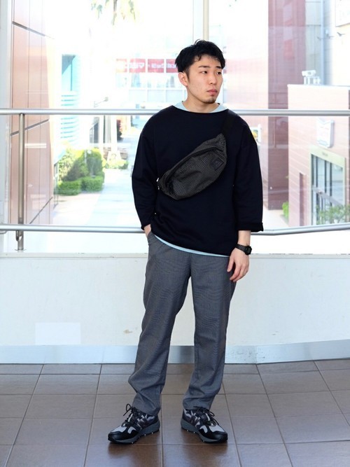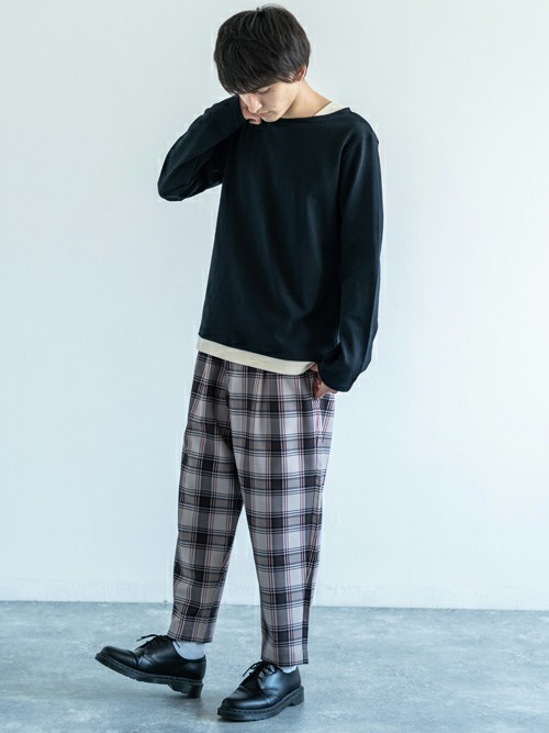 ゆとりがありながらもテーパードになっているパンツと合わせることで、腰回りのバランスもとれています。ボートネックカットソーの丈も丁度よく、綺麗なメンズコーデに仕上がっています。