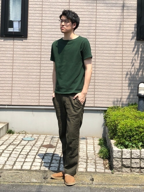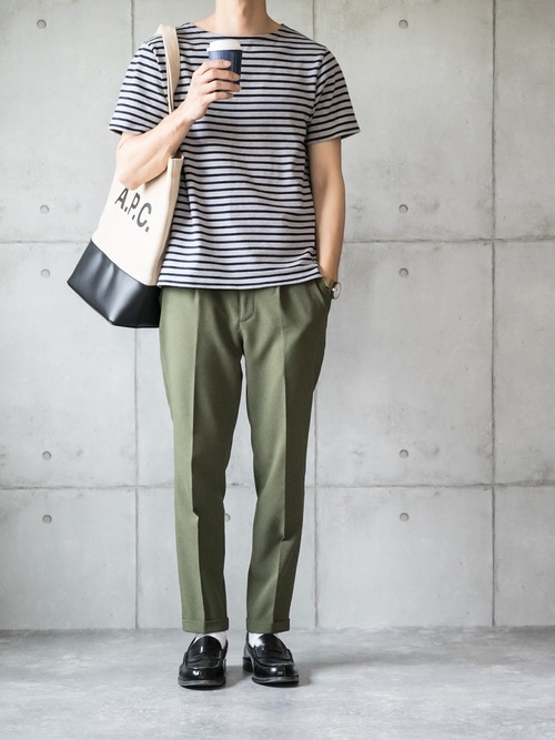 イージーパンツとボートネックTシャツは、グリーン系でも色味を変えることでおしゃれな雰囲気になるでしょう。足元だけ色を外せばハイセンスなコーデになります。