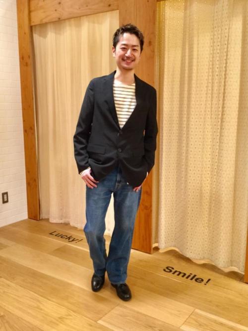 ボーダーのボートネックTシャツをジャケットで大人カジュアルに着こなしています。ボートネックなので、首元のラインがUネックやVネックよりも詰まっているのが特徴。まっすぐに見えるラインがジャケットのシルエットをより美しく高めています。