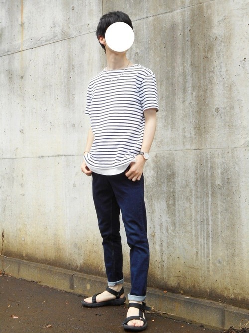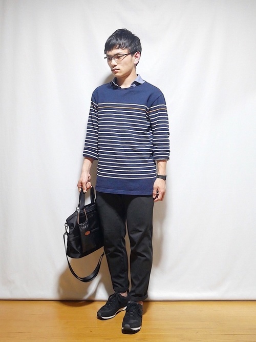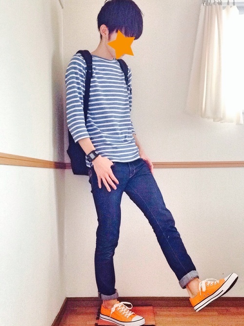 無印の七分袖ボートネックTシャツを使ったコーデです。ブルーのボーダーに濃い色のデニムで洋服はブルーコーデに統一。足元にオレンジのスニーカーを選ぶことで、相性の良いブルー×オレンジのメンズコーデに仕上がっています。