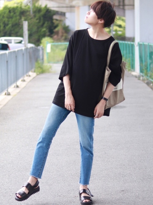 オーバーサイズボートネック×スキニーデニム×サンダル