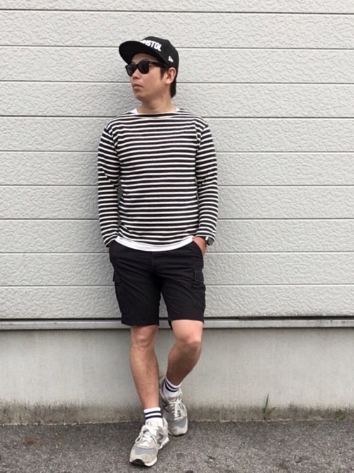 ハーフパンツで合わせたときは、子供っぽくならないように意識するのも大事です。ボートネックTシャツもハーフパンツも、スリムなシルエットを意識して下さい。