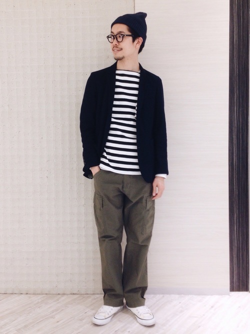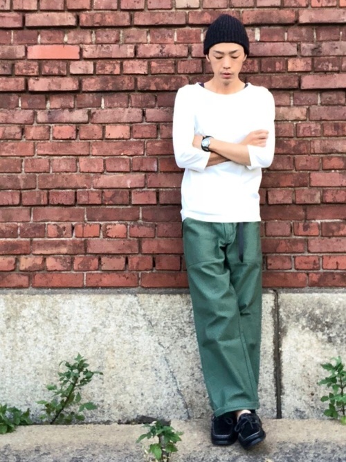 上半身をボートネックTシャツとジャケットでまとめた代わりに、下半身は緩めのミリタリーパンツで外しています。ボートネックTシャツは様々なパンツと相性が良いことが分かるメンズコーデです。