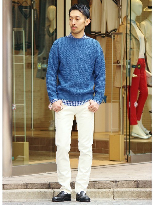ギンガムチェックシャツの上からボートネックのニットを重ね着し、ホワイトパンツで合わせたメンズの爽やかコーデです。ブルーとホワイトを上手に使っており、冬コーデなのに軽さがあるのも特徴です。