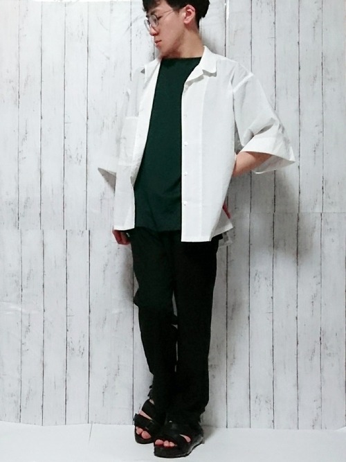 だらしない雰囲気にならないためにも、モノトーンでまとめてすっきり感を出すのもコツです。透け感があるホワイトのシャツもボートネックのTシャツも注目されているため、トレンドを抑えたメンズコーデです。