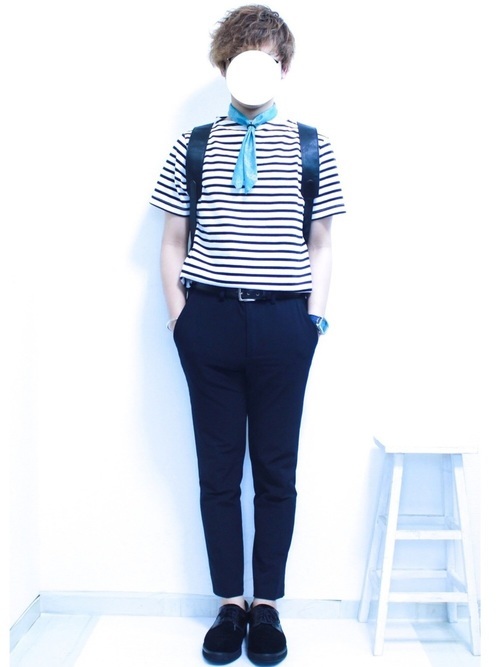 ボーダーのボートネックTシャツとリュックのコーデは一見子供っぽくなりがちです。しかし、細身のパンツを合わせることで大人カジュアルなメンズコーデにまとめることができます。