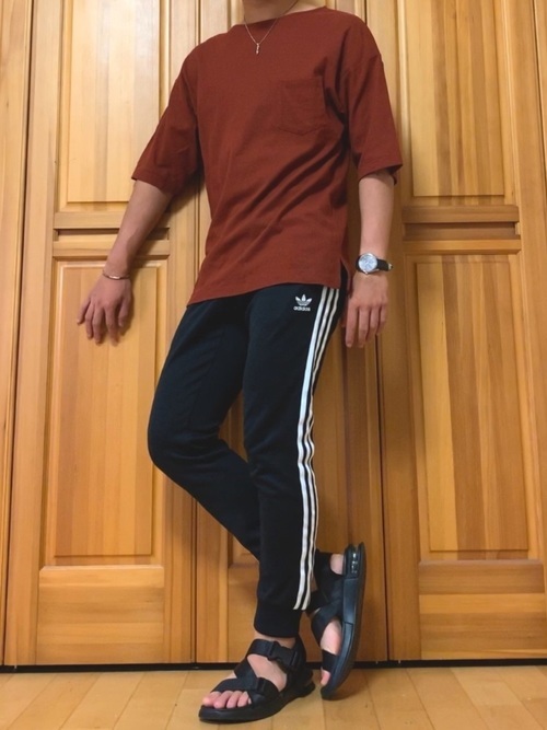 ボートネックTシャツでスポーティーなメンズコーデとなっています。トラックパンツを細身のものにしているため、ボートネックTシャツをオーバーサイズにしてバランスをとると良いでしょう。トップスもボトムスもオーバーサイズになると、だらしなくなるので注意してください。