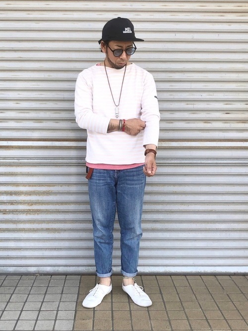 ボートネックTシャツの腕や、パンツの裾をロールアップすることでスタイルが良く見えるメンズコーデにもなっています。ボートネックから出ているシャツの襟があるおかげで、小顔効果が出ているところにも注目です。