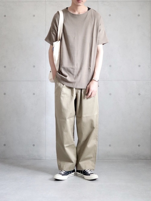 ボートネックTシャツ×イージーパンツ×ベージュシューズ
