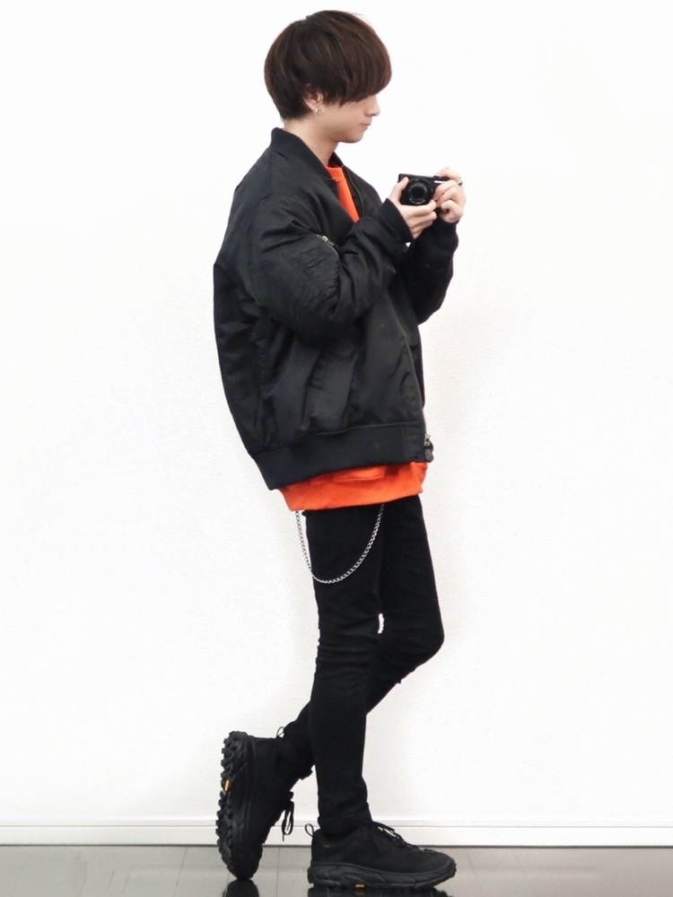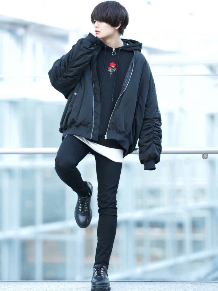 ビッグシルエットの黒MA-1と黒パーカー、さらに黒スウェットとのスタイリング。全体的に黒を多めにしていますが、インナーとして白シャツも合わせて重ねているので、下からのシャツのチラ見せがポイントになっています。さりげなくスウェットの柄が見えているのがまた一段とお洒落。