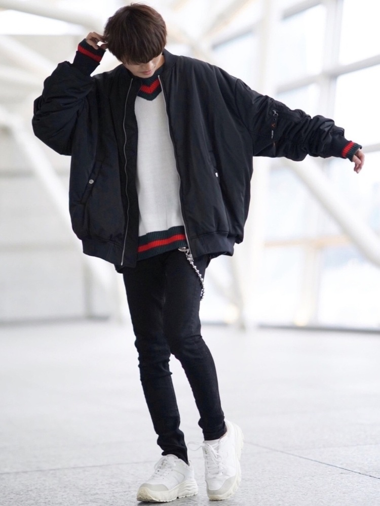 ゆるシルエットのMA-1にカラーライン入りのニットを合わせた、どこか可愛らしさもありながら上手くアクセントをちりばめたスタイル。基本のモノトーンコーデに緑と赤のラインが入ることで、一気にお洒落さがアップしています。パンツや靴は黒や白でモノトーンに統一を。