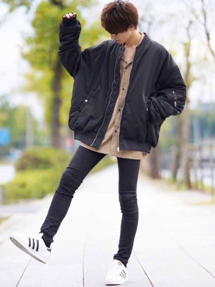 黒のMA-1の下にベージュのシャツを合わせた落ち着きを感じるコーデ。無地のアイテムを合わせているので全体的にはシンプルですが、その分スニーカーのラインが映えて、程よくスポーティーな雰囲気も醸し出せています。