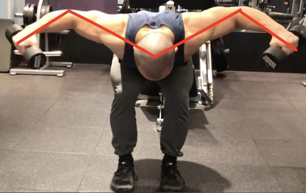 リアデルトフライのコツ&注意点②:ダンベル・肘・頭を結んでM字になる意識を持つ