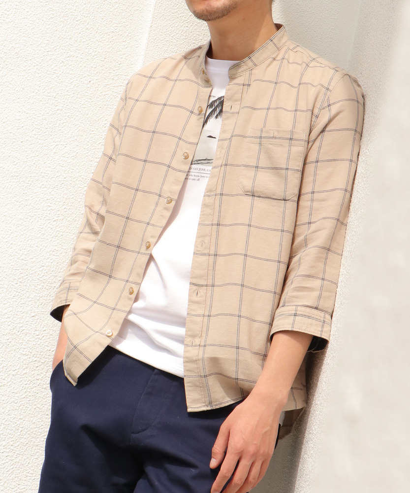 ikka COOLMAXリネン混バンドカラー7分袖シャツ