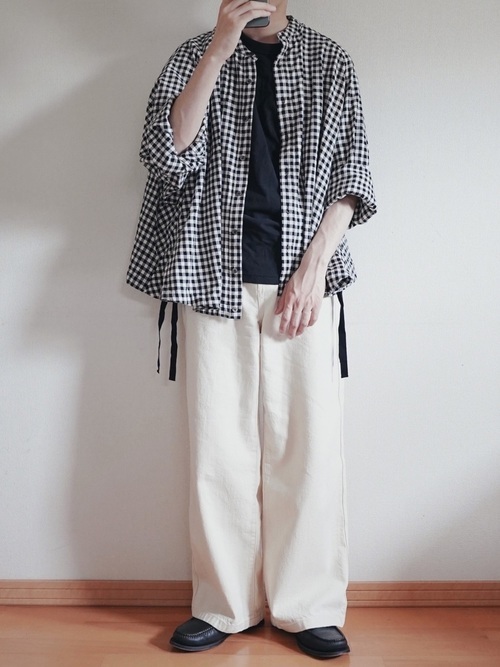 ギンガムチェックシャツ×ワイドパンツ