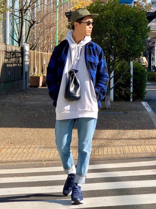 ストリートファッションの代表格であるパーカーの上に青と黒のバッファロチェックーシャツを羽織ることで、パーカーだけではぼやっとしていた雰囲気をがらっと変える良いアクセントとなっています。また、靴も同系色で統一することでまとまりのあるおしゃれなコーデになっています。