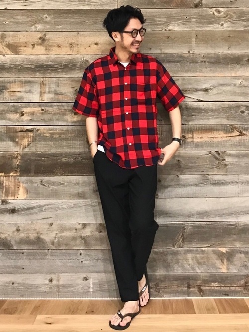 バッファローチェックシャツを一枚で着るシンプルなコーデ。下には黒のスラックスパンツを、足元にはビーチサンダルを合わせることで、ラフな雰囲気を出しつつワイルドな印象にもなります。赤と黒の2色で統一することで、赤が際立ちとても鮮やかな色に見えます。