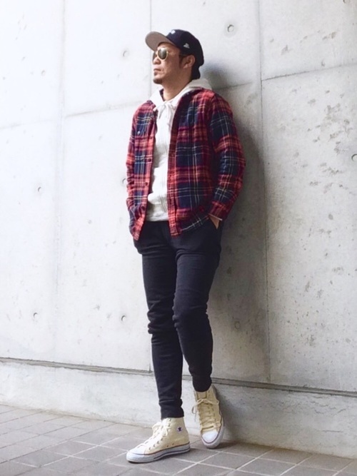 タータンチェックシャツ×パーカー×スキニーパンツ