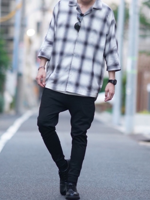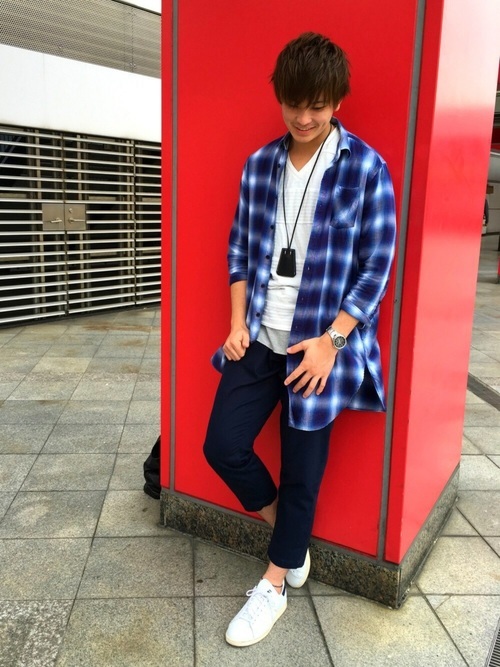 長めの青ベースのオンブレチェックシャツは、爽やかでスタイリッシュな印象を与えます。シャツの下はシンプルに白のTシャツを合わせ、下の黒のスラックスは引き締まったシルエットをより際立たせます。