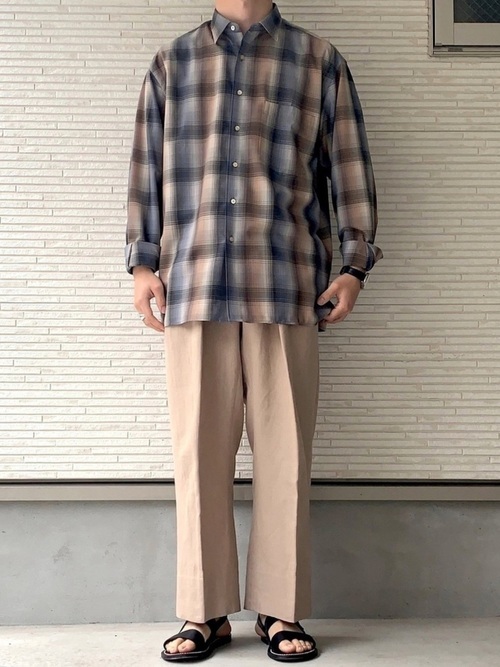 大き目のオンブレチェックシャツを一枚で着るシンプルなコーデです。下は同系色のワイドパンツでダボっとした印象を持たせ、足元はサンダルというラフなアイテムを組み合わせています。