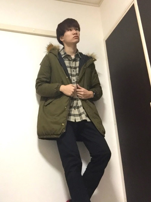 厚手のコートの下にタータンチェックシャツをインナーとして着ることで、色合い的にも防寒の面でも冬にぴったりなコーデとなっています。コートが少し長めなので、下は細身のチノパンツを合わせることで長身の人にはスタイルの良さを際立たせる効果があります。