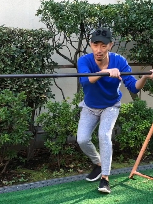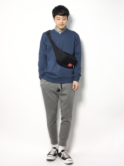 ブルー系Vネックセーター×ブルー系スウェットパンツ