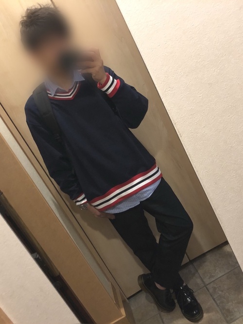リブに柄のあるネイビー系Vネックセーターに、ブルー系シャツを合わせた爽やなコーデです。柄があることでシンプルになり過ぎず可愛らしさも加わっています。シャツの襟と裾のブルーが見えることでコーデ全体が重くなるのを防いでいます。