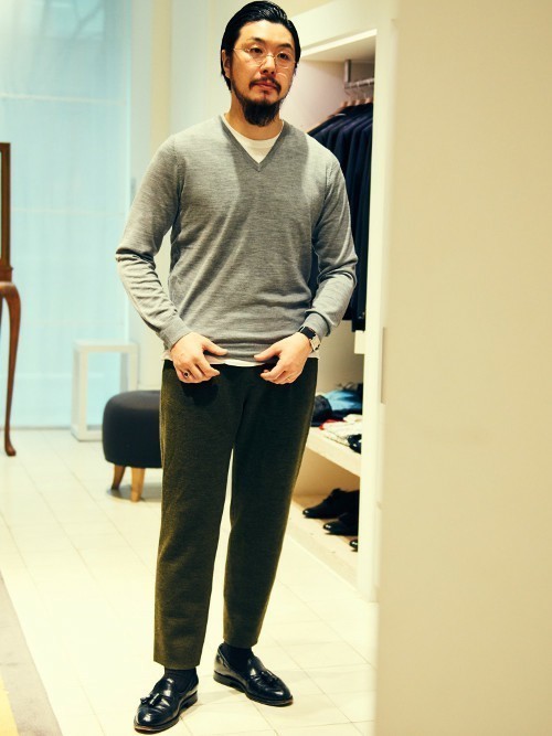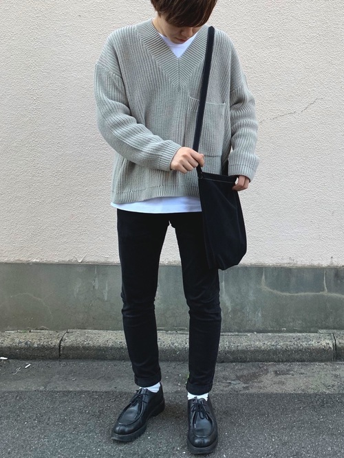 このコーデはグレー系Vネックセーターに、ホワイト系カットソーを重ね着しています。Vネックセーターは首周りに色を持ってくるのがポイントです。グレーとホワイトは相性が良く落ち着いた印象を与えてくれます。また、首周りだけでなくあえて着丈が長いカットソーと重ね着して、裾を見せて全体の色のバランスを整えるのもグッドです。