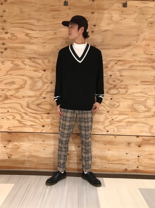 柄が多いと子供っぽくなりがちですが、上手に落ち着いた印象にまとめたメンズコーデです。柄のパンツをタイトなシルエットにし、トップスのセーターもブラックをチョイスしたので子供っぽさがなくなっています。VネックセーターのVネック部分に柄がある場合は、こちらのメンズコーデのように柄と同じ色をインナーに入れるのも良いでしょう。