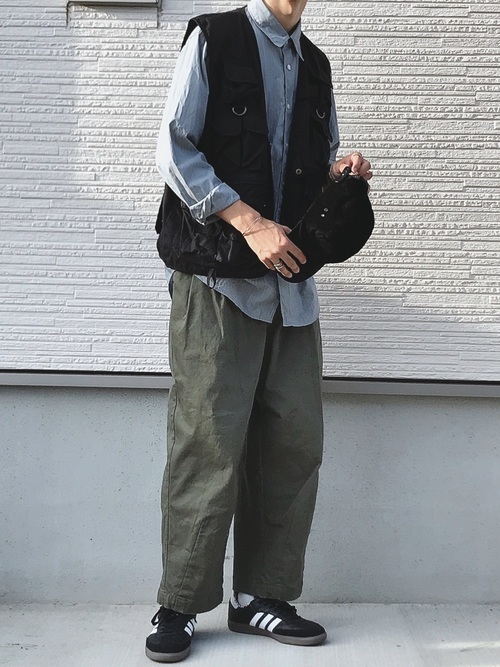 こちらは一つ目のコーデと打って変わっていい男臭さが出ていますね!太めのカーキのワイドパンツが武骨さを主張し、黒のアウトドアベストがそれを何倍にも引き立てています。