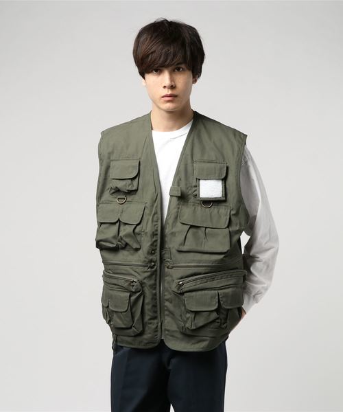 裾と襟元から顔を覗かすインナーシャツもポイントですね!腰回りの色が豊かになり、重くなりすぎるのを防いでいます。このような男臭いベストの着こなしは、ミリタリーファッションの特有の魅力です。