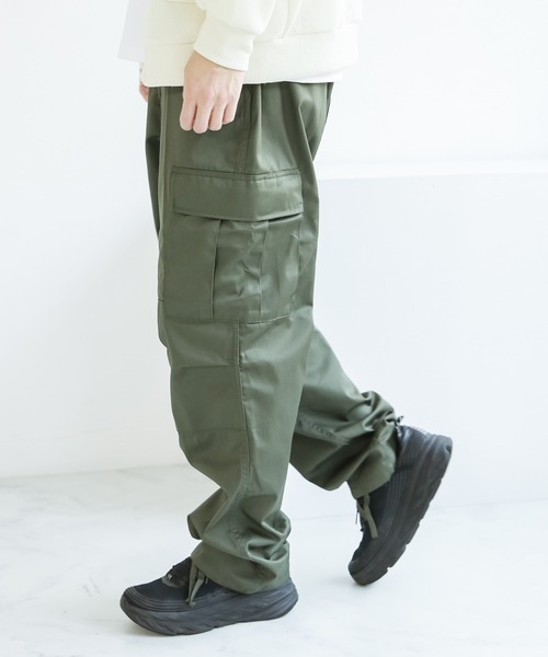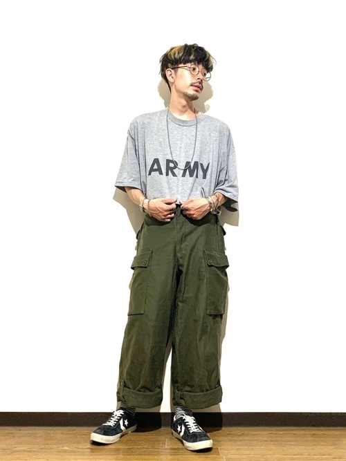まずは太め。太めのカーゴパンツは「ワイルド」「男らしさ」などの印象を与えることができます。ミリタリーはもともと「軍用」のアイテムなので、まさにミリタリーを体現したようなアイテムですね。