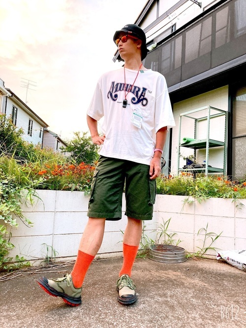 こちらはショーツを使った夏コーデです。カーキのアウトドアショーツミリタリー感を出しながらも、オレンジの靴下で足元を引き締めラフになりすぎるのを防いでいます。